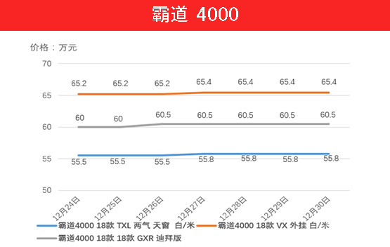 霸道4000在上周的表现还算平稳。三款车型虽说都出现了些许的涨幅,但还在预期之中,畅销的白色车源紧缺也是这次部分车型涨价的原因。