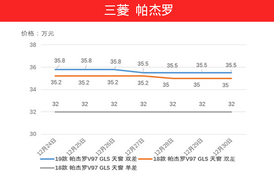 如果以性价比论英雄的话相信在今年没有比帕杰罗( 参数 | 询价 )更出挑的车型了。上周18款GLS天窗单差车型保持不变,18款GLS天窗双差下降2000元,19款 天窗 双差车型则下跌3000元。