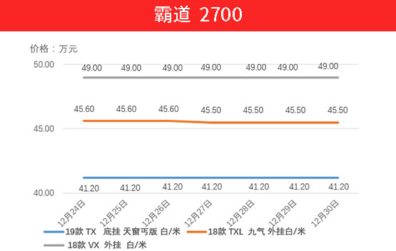 与帕杰罗相比霸道2700就显得不出众了。上周其三款车型并没有出现大的波动,仅18款 TXL车型下降1000元。