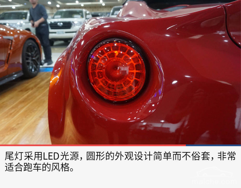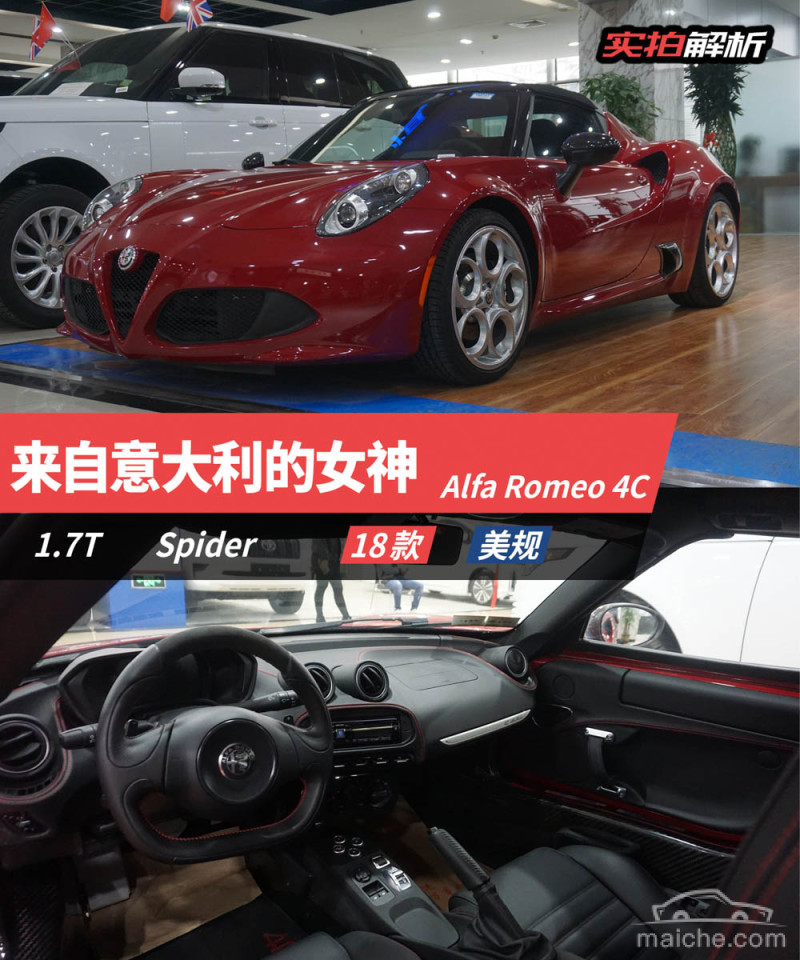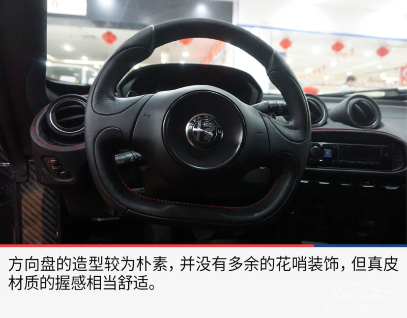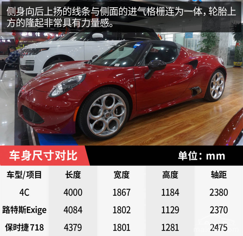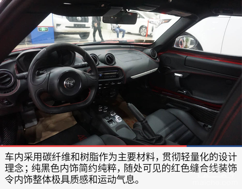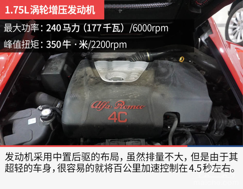 总结:总的来说,这款阿尔法罗密欧4C是一款相当原始的车型,从外观上来讲,它的颜值可以说是不输任何公路赛车;内饰方面,座椅方向盘都是动感十足的赛车造型;动力虽然没有想象中那么强劲,只有1.7的排量,但是由于座舱采用碳纤维材料,大大减轻了车身质量,超轻的车身足以让它的百公里加速达到4.5秒左右。在我看来,这台车并不适合日常使用,没有转向助力、乘坐空间一般、储物空间近乎为零。如果你只是为了满足自己的兴趣,享受驾驶的乐趣,这台经销商报价为115万元的阿尔法罗密欧4C确实是不错的选择。