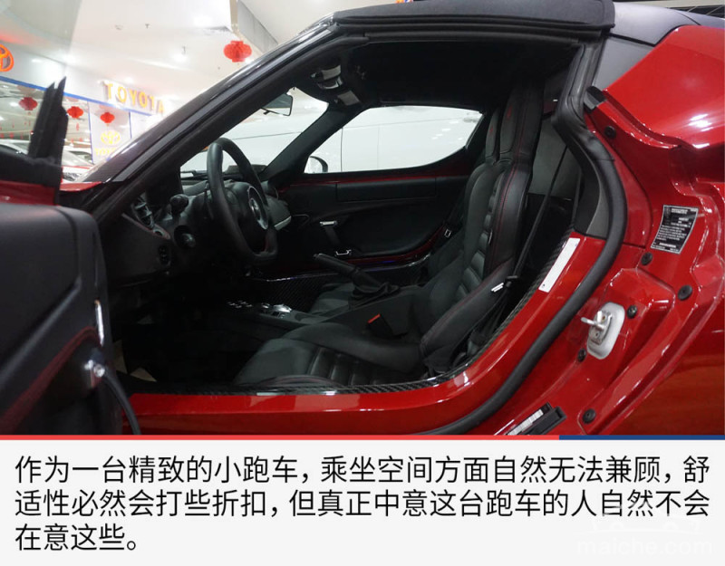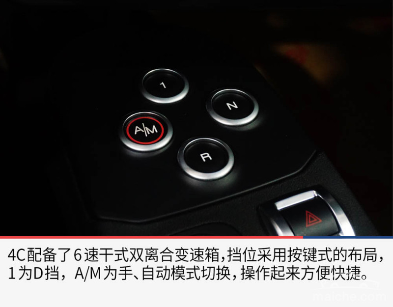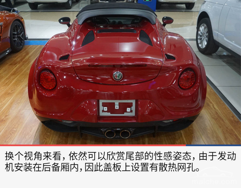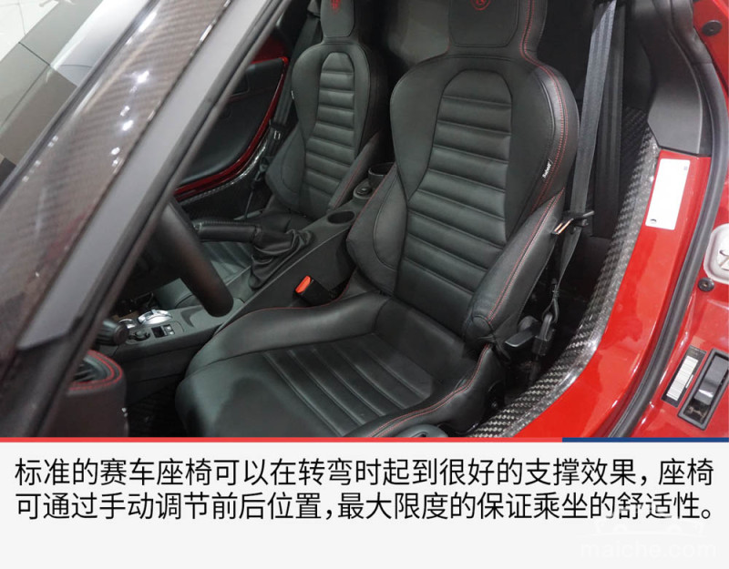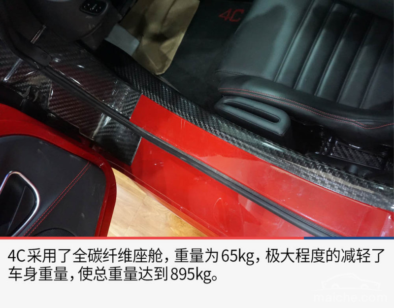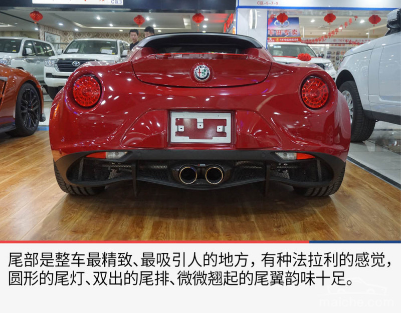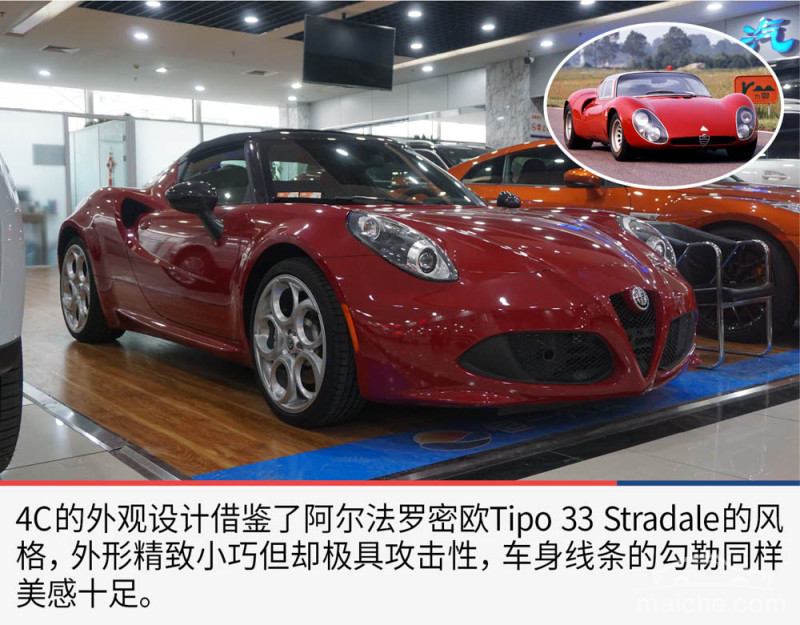 总结:总的来说,这款阿尔法罗密欧4C是一款相当原始的车型,从外观上来讲,它的颜值可以说是不输任何公路赛车;内饰方面,座椅方向盘都是动感十足的赛车造型;动力虽然没有想象中那么强劲,只有1.7的排量,但是由于座舱采用碳纤维材料,大大减轻了车身质量,超轻的车身足以让它的百公里加速达到4.5秒左右。在我看来,这台车并不适合日常使用,没有转向助力、乘坐空间一般、储物空间近乎为零。如果你只是为了满足自己的兴趣,享受驾驶的乐趣,这台经销商报价为115万元的阿尔法罗密欧4C确实是不错的选择。