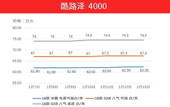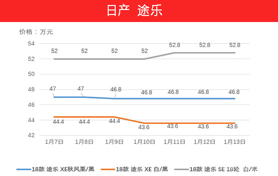 上周途乐( 参数 | 询价 )的价格波动十分巨大,前两周低配车型急速拉升的售价导致其销量有所下降,截止1月13日途乐XE车型回调至43.6万元算是回到了正常区间。高配车型价格上涨则是由于该车型的库存量本就不多。