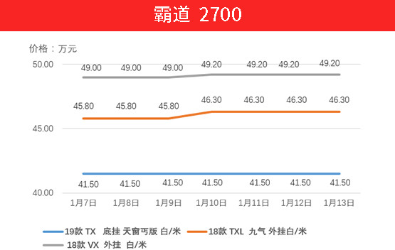 霸道系列仍处在库存少的尴尬境地,一方面经销商不愿意加价可又不得不加价。上周三款车型除低配车型外都出现了上涨,TXL 九气 外挂车型上升5000元,VX外挂车型上升2000元。