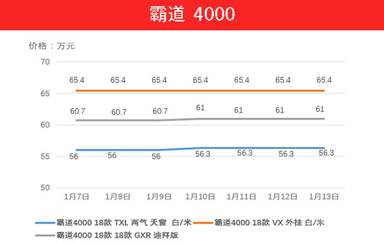 霸道4000的涨幅还算合理。高配车型价格无波动,中低配车型上涨区间均控制在4000元以内。