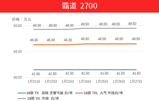 霸道系列的车型则是另一个极端,上周18款TXL 九气 外挂车型与VX 外挂车型均上升2000元,特别是白色车源更是一车难求。