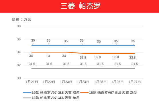 帕杰罗( 参数 | 询价 )的近期价格走势与途乐十分相似,虽然也是主打性价比但其销量远没有途乐好,主要原因还是帕杰罗久不改款产品力度跟不上。