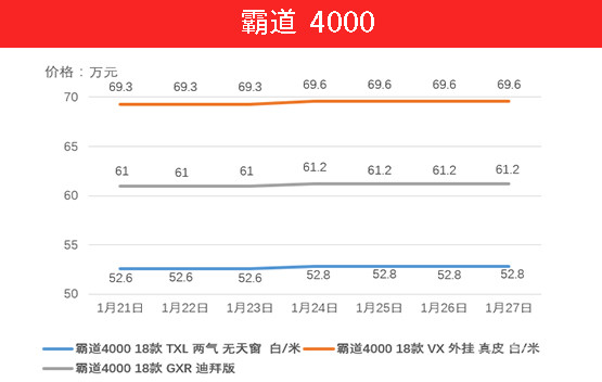 霸道4000的售价也有不同程度的走高,不过好在3款车型均控制在3000元以内,想在农历新年前提车就只能选择价格偏高的车型。