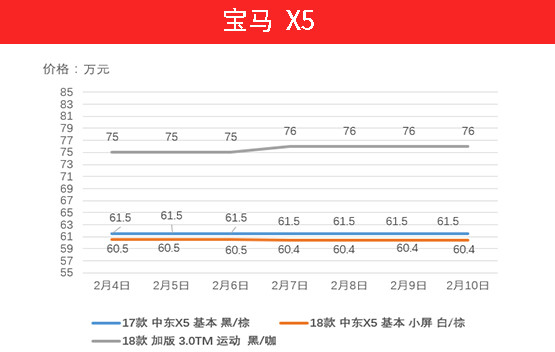 作为豪华品牌领头羊的宝马X5其销量曾经高居三甲,排量风波后虽然有所缓解但完全没有了往日的风光。上周X5低配车型变化并不大,而加版高配车型则上升10000元。