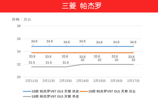 帕杰罗( 参数 | 询价 )的情况与途乐十分相似,也是与年前压缩到极致的价格有关。上周18款天窗 单差 车型上涨4000元,而19款车型与双差车型由于库存量大的原因价格未变。