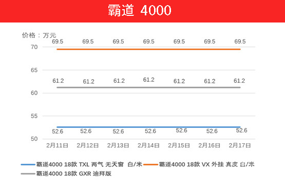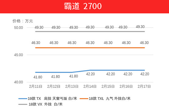 霸道系列车型的价格从开年就居高不下,上周上涨力度有所减缓。上周18款TXL 九气 外挂车型与VX 外挂车型均保持不变,仅19款天窗丐版车型上升4000元。