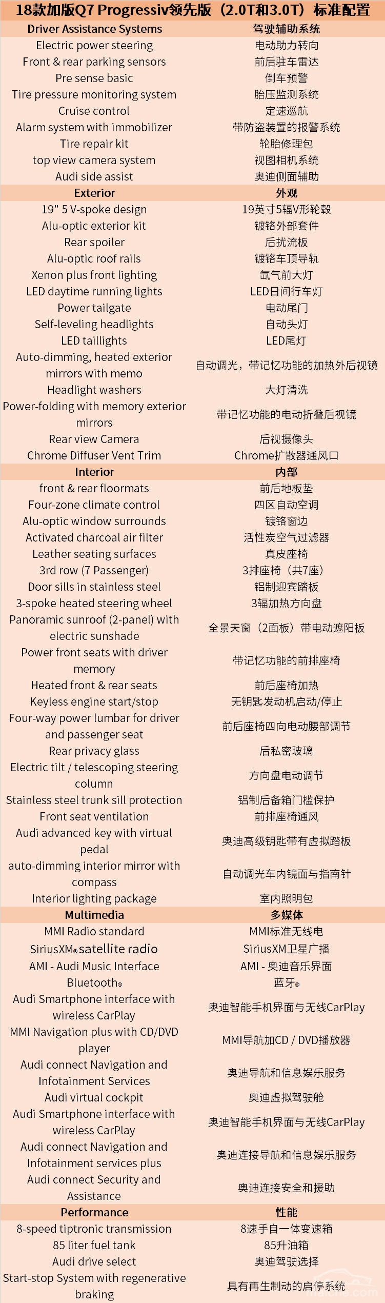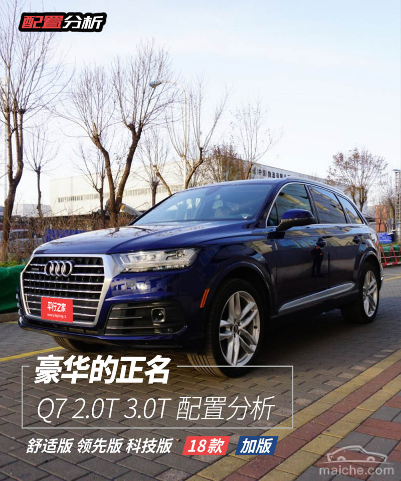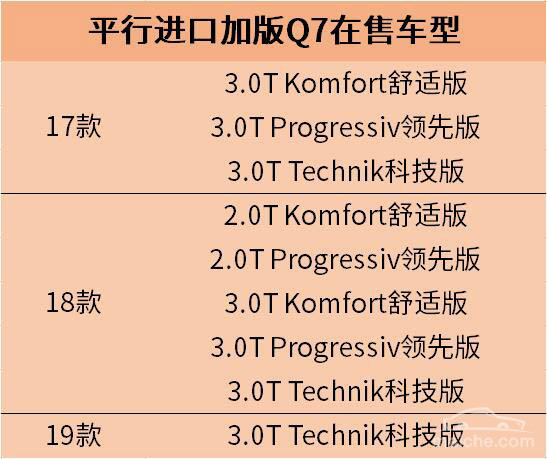目前加版Q7市面上最热卖的是18款车型,除此之外还有17款以及少量新到国内的19款Technik科技版, 18款主要有2.0T Komfort舒适版、2.0T Progressiv领先版、3.0T Komfort舒适版、3.0T Progressiv领先版、3.0T Technik科技版,本文主要以18款车型为主。