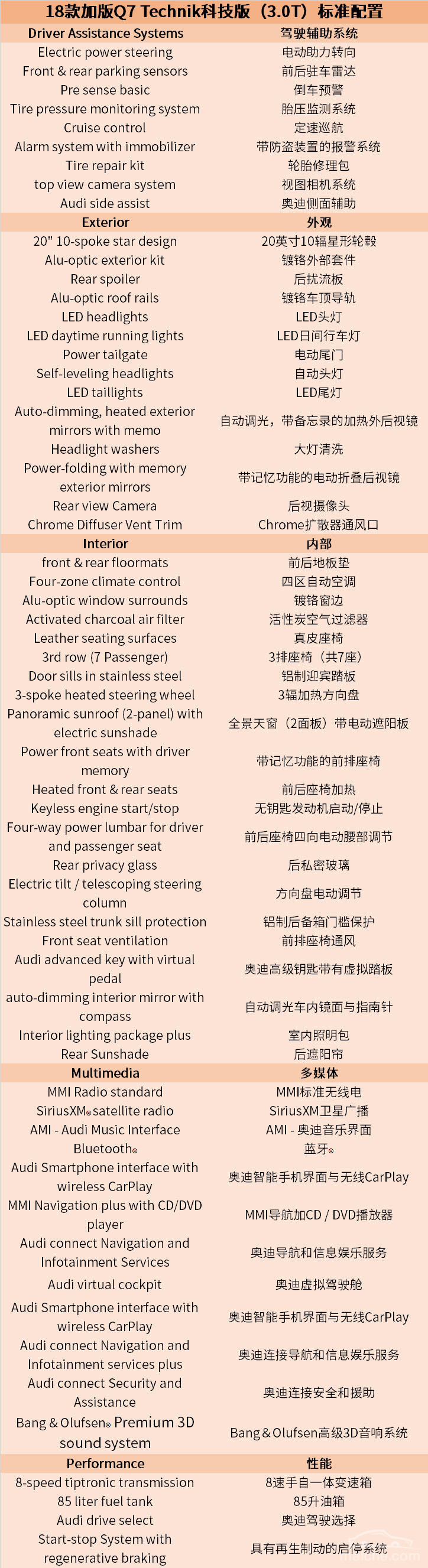 总结:虽然奥迪Q7有中规车型,但平行进口奥迪Q7以其更加丰富的型号、更加优惠的价格广受关注。平行进口Q7有加规、美规、欧规、墨规,其中加规车型最为齐全和丰富,通过本文的介绍,相信大家对平行进口的加版Q7有了一定的了解,在选择Q7时能够买到最符合心意的一款。