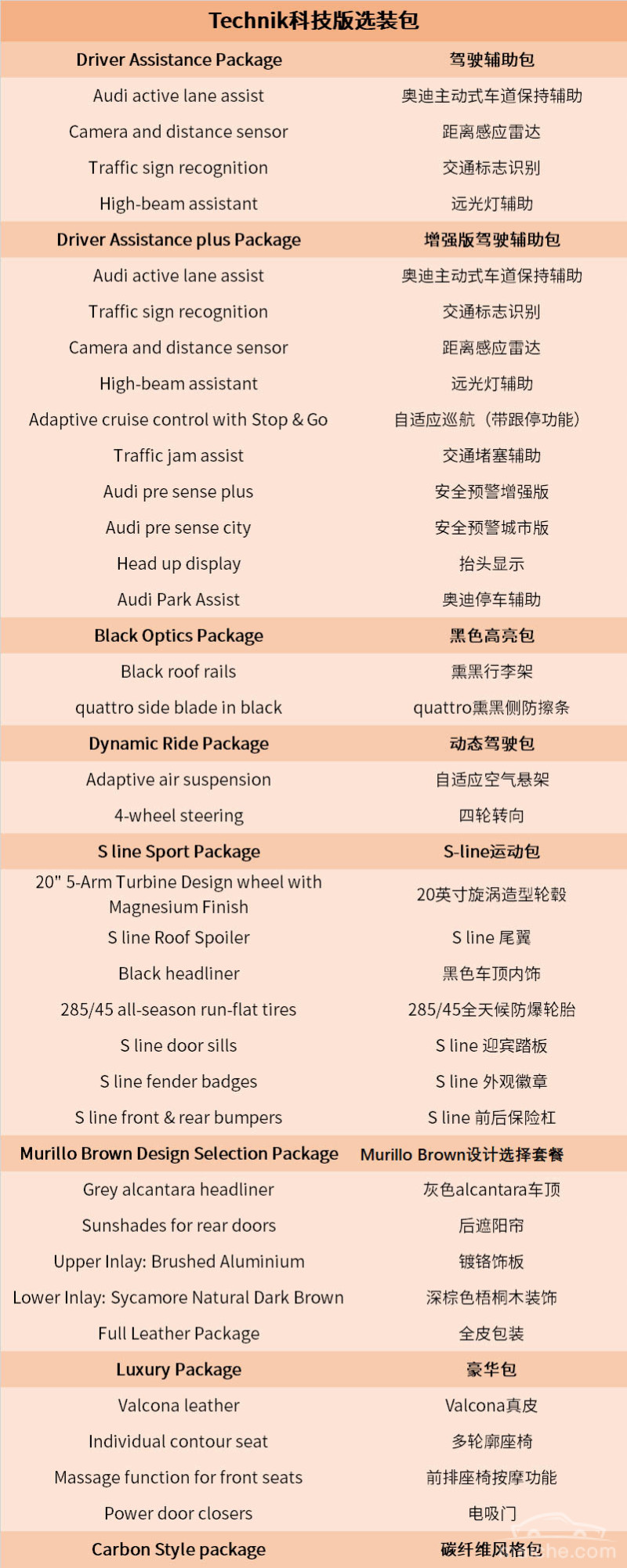 Progressiv领先版可以选择驾驶辅助包、驾驶辅助增强包、黑色高亮包、动态驾驶包、S-line运动包,Technik科技版除了可以选择上述五种选装包以外,还可多选择Murillo Brown设计选择套餐、豪华包、碳纤维包。