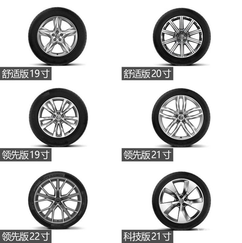 舒适版(包括2.0T和3.0T)有两种轮毂可供选择,19英寸的轮毂为五辐造型,需搭配规格为255/55的轮胎;20英寸的轮毂为十辐造型,需搭配规格为285/45的轮胎。