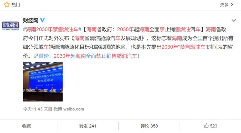 海南官方表示,至2030年,全域禁止销售燃油汽车,力争全省汽车清洁能源化达到国际标杆水平。