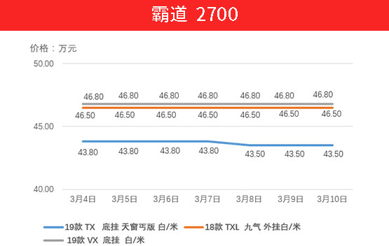 霸道2700的价格表现还算正常,随着排放政策越来越严格,目前经销商的策略也是想尽快出手库存车型,降价销售是大势所趋。上周19款TX车型下降3000元,TXL 九气 外挂车型与VX 外挂车型保持不变。