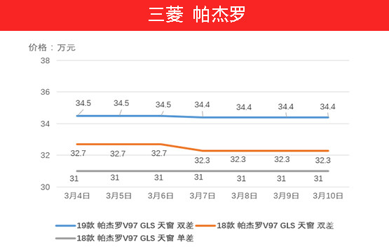 超选四驱、双差也挽救不了山猫帕杰罗( 参数 | 询价 )的价格触底。上周除18款帕杰罗单差车型保持不变外,另外两款车型的价格均有下降,其中19款双差车型下降1000元,而18款双差车型下降4000元。