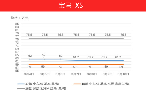 随着新款X5即将交付,拥有不少库存量的经销商已经感到了相当大的压力,目前港口的经销商已经逐渐开始消化库存。上周18款X5保持在59万元左右,而17款车型价格继续走低,相信在不久的将来也会到达60万元关口。