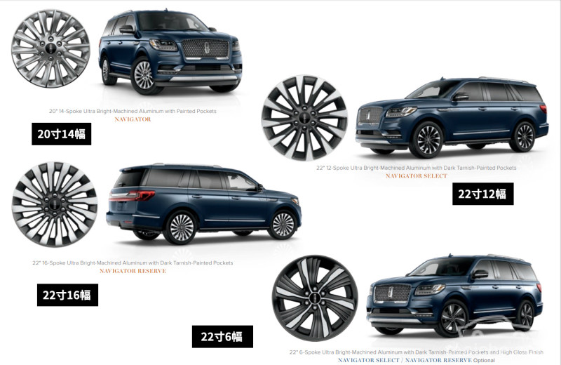标配车型标配20寸14幅轮毂,中配车型标配22寸12幅轮毂,高配车型标配22寸16幅轮毂,顶配车型则配备22寸21幅轮毂。其中22寸6幅黑色高光铝合金轮毂则在中高顶配车型中可选。中规则仅提供22寸12幅铝合金轮毂及22寸16幅铝合金轮毂。