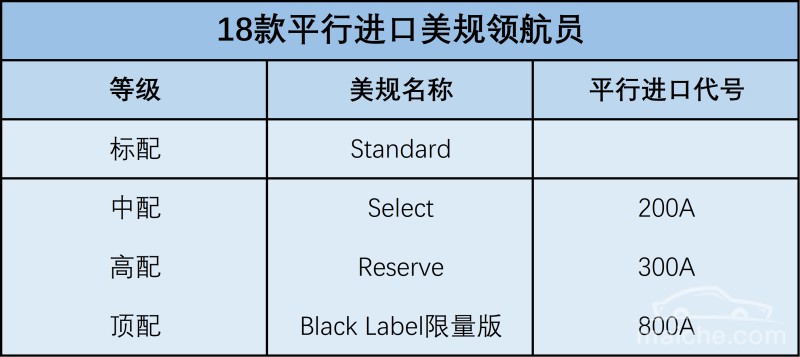 美规的领航员分为标配、中配、高配、顶配四种配置,由于标配未引进国内,目前只有中高顶配三种配置可选,而根据配置不同,平行进口中通常将其成为200A、300A及800A。