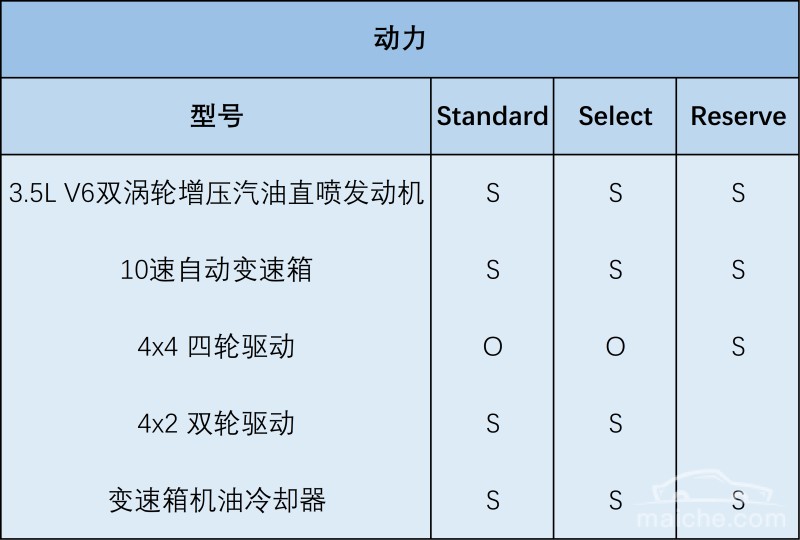 动力上,全系仍然标配3.5T V6发动机,变速箱由6AT升级为10AT。高配及顶配版默认为四驱版,而标配及中配则为可选。