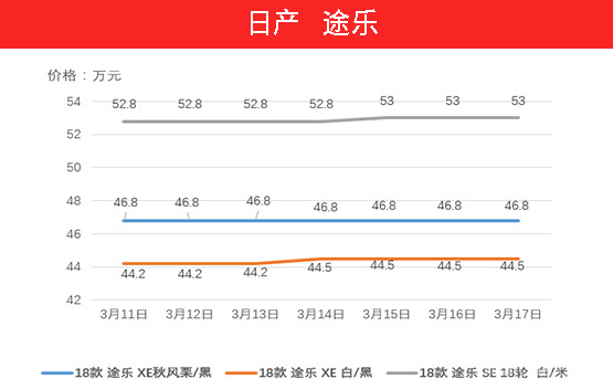 上周日产途乐( 参数 | 询价 )的价格又有上扬的趋势,不过幅度不大。除秋风栗/黑车型价格不变外,其他两款车型波动均控制在3000以内,其中XE白/黑车型上升3000元,SE 18轮 高配车型上升2000元。