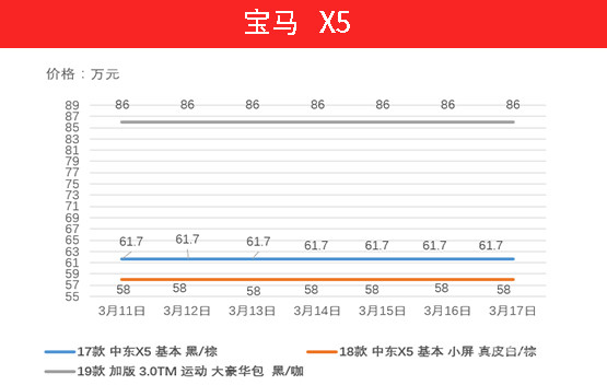 宝马X5( 参数 | 询价 )近期价格相对更为稳定,18款X5低配车型跌破60万元大关后并未反弹也是因为库存量大的原因。