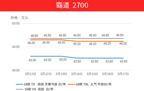 霸道2700的表现也十分亮眼,现在的排气政策并不明显,目前更多人会去选择观望。上周19款TX车型下降4000元,TXL九气 外挂车型下降3000元,VX 外挂车型保持不变。