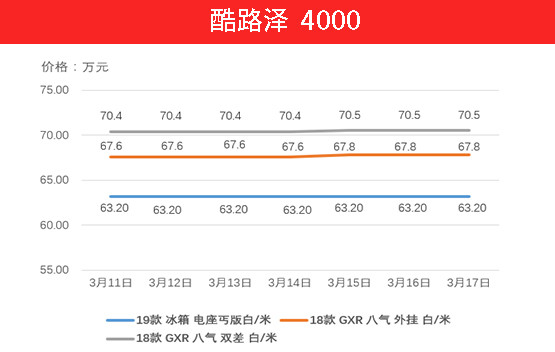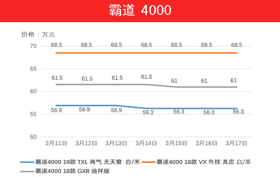 霸道4000价格相对来说下降幅度更大。19款 TXL为6000元,18款GXR车型下降5000元,高配车型依然坚挺。