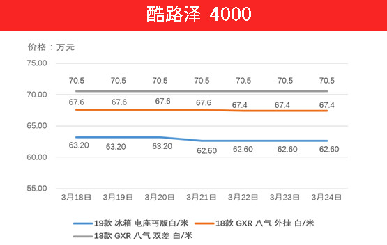 兰德酷路泽( 参数 | 询价 )价格也有波动,特别是低配的冰箱电座丐版车型,价格已经下探至62万,这个价格区间对于兰德酷路泽来说非常舒服。其他两款车型变化不大。