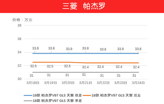 帕杰罗( 参数 | 询价 )的价格在上周逐步稳定,略微的波动可以忽略不计。随着不停的降价如今的帕杰罗销量逐步增加,认可其品质的消费者也越来越多。