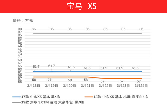 宝马X5( 参数 | 询价 )作为豪华车的代表车型在上周也有所下跌,其中18款X5低配车型跌破至57万元,17款中东X5基本型则仍在61.5万元左右徘徊。