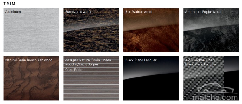 内饰条则比中规多出两种选择,分别为豪华包中的designo天然木质纹理,带浅色条纹内饰条和AMG黑色钢琴漆面。