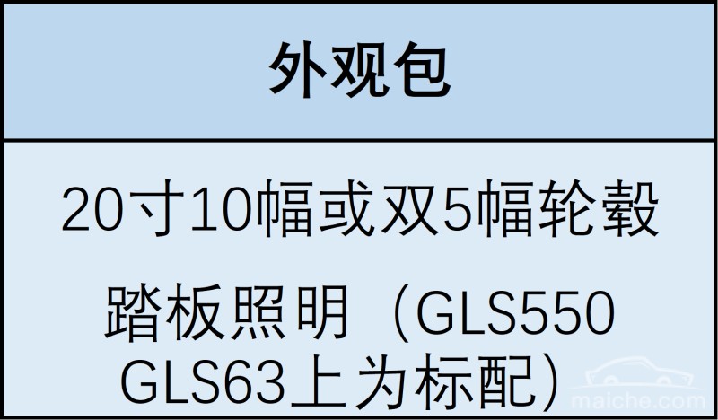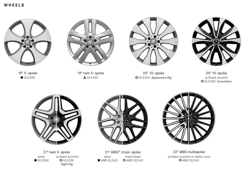 美规版轮毂选配丰富,共有七种选择,中规仅有五种选择。其中GLS 450标配19寸5幅,可不加收费用选择19寸双5幅轮毂。依据选装包的不同还可以选择20寸10幅和20寸10幅黑边轮毂。GLS 550则标配银色21寸双5幅轮毂,可选带黑边版本。AMG GLS( 参数 | 询价 ) 63则标配银色21幅AMG轮毂,可选配黑色版本,此外还可选择22寸多幅轮毂,有银黑两个版本。