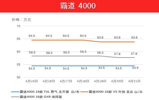 如今的霸道4000则不存在封堵一说,上周4000极为走量的19款 TXL 两气 无天窗保持不变,迪拜版车型下降5000元,18款VX外挂 真皮 车型则下降7000元。