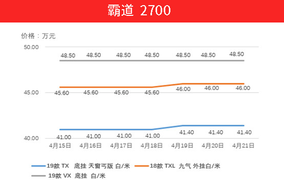 中东版丰田霸道2700,是2017年平行进口车的销量冠军,但是,进入2018年之后,它的好日子就结束了,因为丰田官方为了保护国产普拉多( 参数 | 询价 ),决定封堵平行进口的中东版,减少了霸道在中东地区的供货量,导致霸道的平行进口量萎缩了一半,车源价格也因此居高不下。目前,2019款霸道2700的起步价,都在41万元以上。今年头两个月,中东版霸道的进口量继续萎缩,比去年同期又减少了一半,因此,未来价格仍然很难下降。上周 19款TX 底挂 天窗 丐版上升4000元,18款TXL车型也上升4000元,VX底挂车型不变。