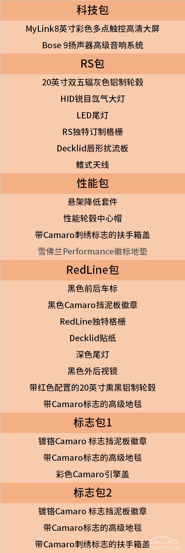 平行进口到国内的加规科迈罗有些会添加选装包,常见的有RS包和科技包,除此之外,加拿大官网上还有一些性能包和外观、内饰的装饰包。