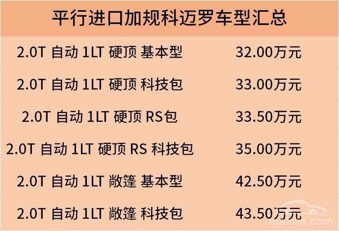 科迈罗虽然也有中规进口车型科迈罗RS,但仅仅只有这一种车型,也没有选装包可选,非常单一,而加规科迈罗的车型就相当丰富了,有1LS、1LT、2LT、1SS、2SS、ZL1(配置从低到高)六种车型,虽然平行进口到国内的只有1LT版,但是也有基本型、RS包、科技包等不同选装包的车型,以及硬顶和敞篷版车型,具体车型可参考上表。