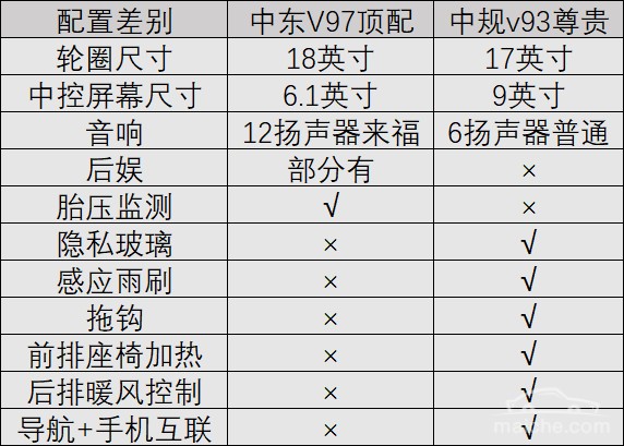 那么相比中规版V93,中东版本有哪些优势呢?相信很多人会说动力,是的,中东版V97在动力上相比中规V93高了两个量级,对于越野车来说排量大才是王道,拥有更多的动力和更大的扭矩才能在越野时显得游刃有余,在危急关头也能更加迅速的脱离险境。以下为中规V93自动尊贵型与中东版V97的配置差异。(中规车型只有最顶配的尊贵型才带有后差速锁,其他车型想对比还差点意思)