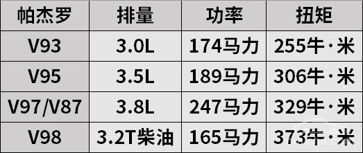 以上就是帕杰罗在售车型的四款发动机,其实也不难理解为何现如今平行进口市场是以V97、V87为销售主力,V93、V95动力优势不足,而V98又是柴油车型。接下来进入我们今天的主题,V97的配置分析环节。
