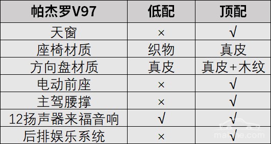 帕杰罗V97的基本配置并不算丰富,当然这也是帕杰罗价格低廉的一大原因,由于长年没有换代的缘故,V97的配置差别也很简单,仅分低配和顶配两种,两者的核心差异在于有无天窗和真皮座椅,这两种配置的详细差别可看下表:
