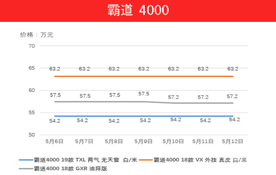 霸道4000的价格,已经走进了它的舒适区域,当然国产3.5停产的消息势必会影响它的销量,不过就目前来说影响不大。上周迪拜版车型下降3000元而VX外挂 真皮 车型与TXL两气车型均未发生变化。