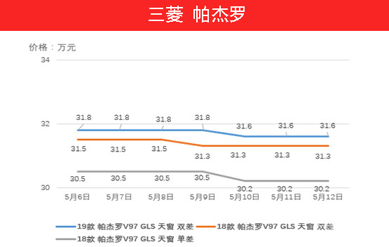 三菱帕杰罗V97的性价比很高,价格也有继续下滑的趋势,近期销量也不错,看来价格还是能左右许多消费者的选择的。上周帕杰罗( 参数 | 询价 )三款车型均出现了下跌,其中19款天窗 双差车型为3000元,18款天窗 双差车型与18款天窗 单差车型均为2000元。