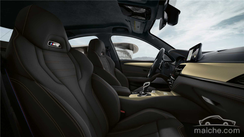 内饰部分,新车配备了M专属运动座椅,其采用BMW Individual Merino黑色皮革制成,搭配米色针脚。比较抢眼的还是金色碳纤维中控台以及门饰板,中控地台处还雕刻有“M5 Edition 35 Jahre”标识。此外,在M运动挡杆的前端,也增加了35周年特别版的图案。