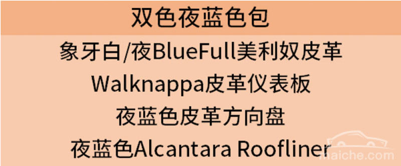 内饰选择有两种风格十种配色,一种是纯真皮,另外一种则是带有印花的。小编个人比较喜欢最后一个蓝白相间的内饰风格,但是我估计大多数人更会偏向与马鞍棕的内饰吧。