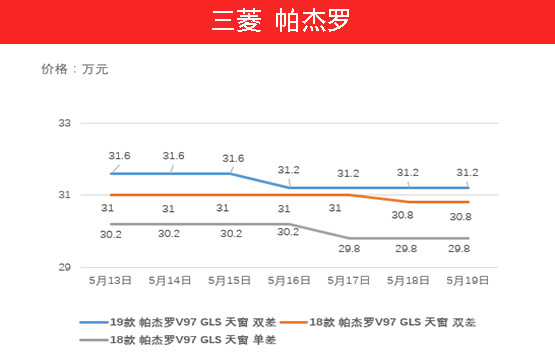 上周帕杰罗( 参数 | 询价 )的价格也在持续下降,降价的趋势更加急迫,毕竟它的产品竞争力度还是比不了途乐以及霸道2700的。其中19款天窗 双差车型和18款天窗 单差车型下降均为4000元,18款天窗 双差车型为2000元。