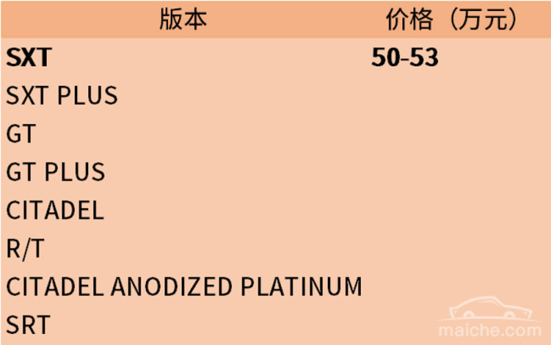 加黑部分就是车商引进的车型(其余车型未引进)目前报价为50-53,其实SRT才是杜兰戈的精髓,4.4秒百公里加速作为一款中大型SUV可以进前五了。