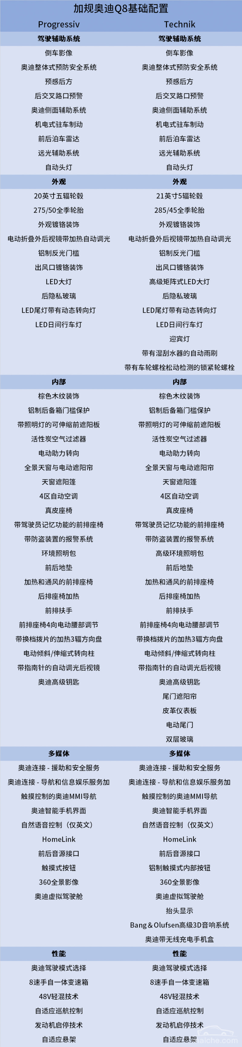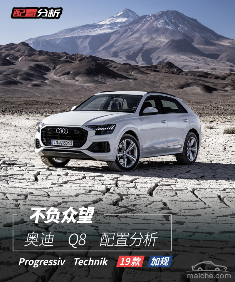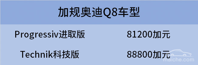 奥迪Q8目前有两个版本的车型,Progressiv和Technik,翻译过来就是进取版和科技版,两个版本的Q8在动力上是完全相同的,仅仅是配置上有高低之分。