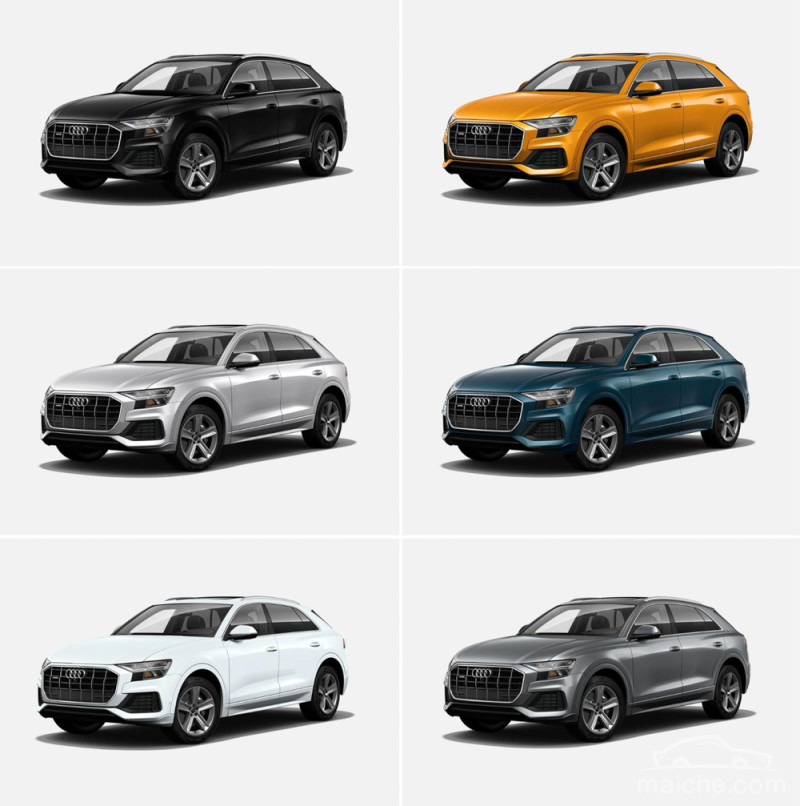 Q8的外观设计语言时尚前卫,既保留了奥迪传统的家族风格,豪华感十足,也将Coupe造型运用的十分完美,做到了将时尚动感和尊贵豪华融为一体。官网给出的可供选择的外观颜色共有9种,包括六种基础配色,以及三种需要添加选装包后才能选择的配色。