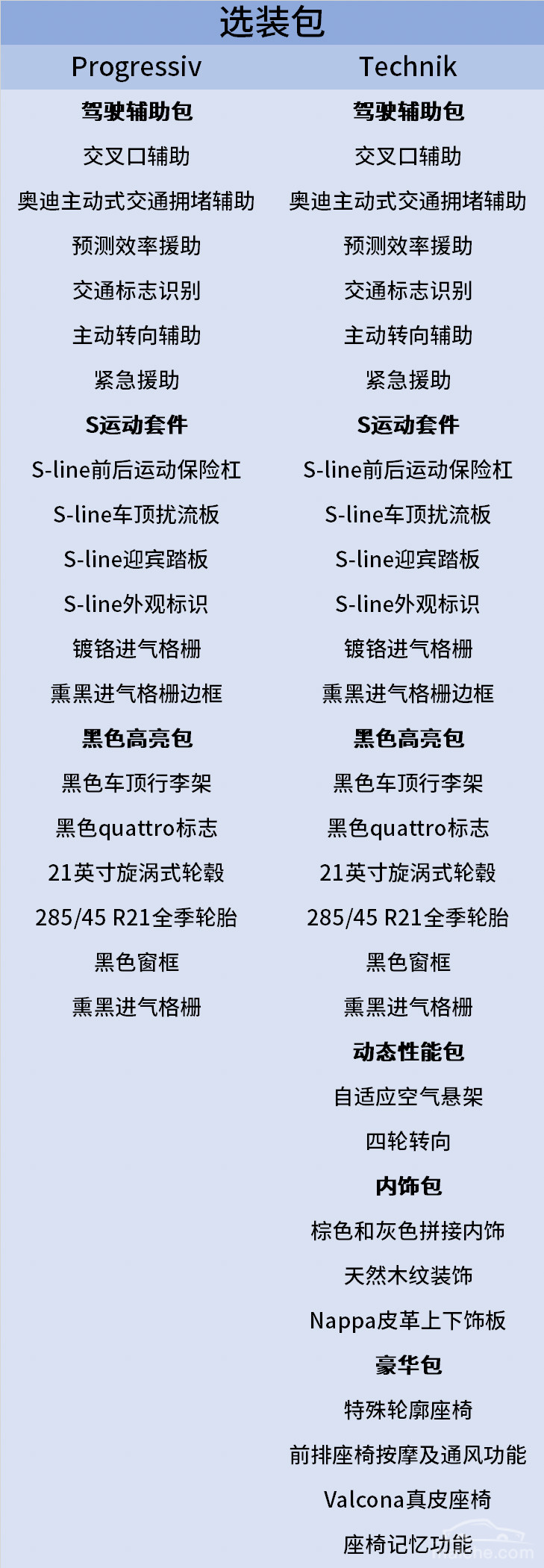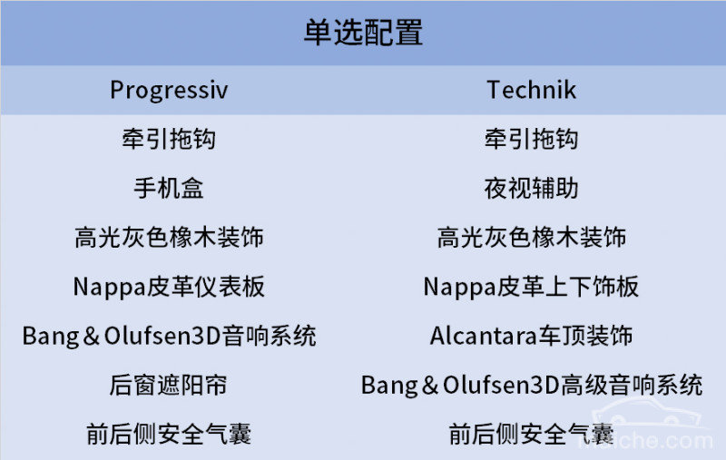 Technik版共有6种选装包,包括辅助功能包、动态性能包、运动外观和黑色高亮外观、以及豪华内饰装饰包等。而Progressiv版则只有辅助包和S运动包、黑色高亮包可供选装。